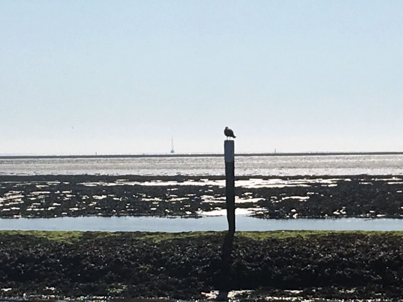 In der Waddenzee wird nicht einfach in die See gestochen, wenn einem danach ist, sondern erst dann, wenn die Wassertiefe-höhe und die Strömung es zulassen. So hatten wir am nächsten Morgen noch genug Zeit, um eine Düne zu erklimmen und im Matsch zu waten.