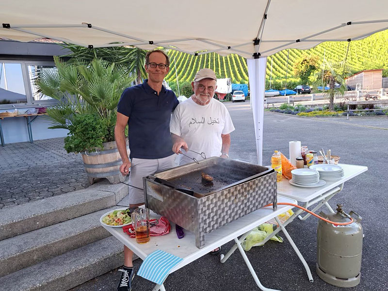 Nach dem der offizielle Beginn der Veranstaltung mit einem Fäßchen Freibier um 18 Uhr verkündet wurde, gab es kein halten mehr. Der Grill glühte bereits und die gespendeten Salate standen bereit. Und so bildete sich schnell eine kleine Schlange hungriger Besucher.